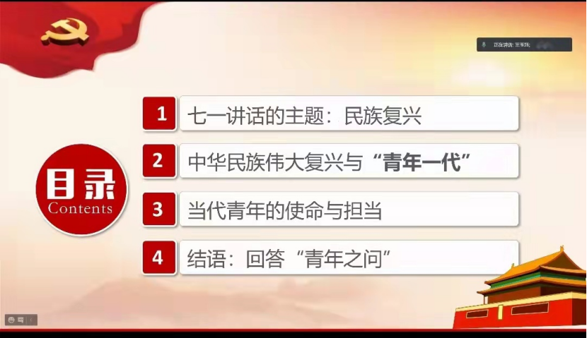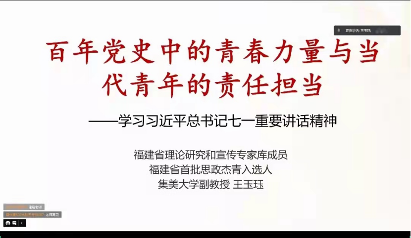 10月22日,学院通过线上举办《习近平总书记在庆祝大会上重要讲话精神——百年党史中的青春力量与当代青年的责任担当》专题讲座。本次讲座特邀马克思主义学院王玉珏副教授主讲,由院党委书记王小军主持,学院全体教职工、党员、学生听取了讲座。
