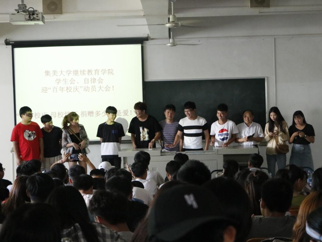 9月26日13点,继续教育学院在集诚楼召开学生会、自律会学生干部迎“百年校庆”工作动员大会,共200余人参加,动员学生干部在集美大学“百年校庆”之际,以“百年校庆,母校情怀,捐赠多少都是爱”为主题进行献爱心活动,并要求学生干部把对母校的爱深入宣传到学生班级和学生宿舍中。