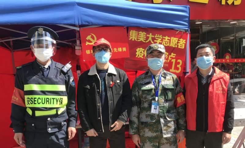 在集美街道我校志愿者疫情防控点,学院教职工穿上志愿者服装,佩戴校徽、党徽,亮出身份,与社区工作者们并肩作战,承担和完成人员进出测量体温、跟踪排查、宣传劝导等社区防控任务,缓解了社区工作人员的工作压力。