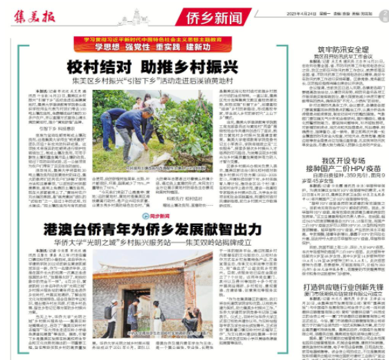 4月23日,我院牵头组织学校师生代表20余人前往集美区后溪镇黄地村开展“引智下乡”助力乡村振兴活动。厦门电视台(厦视新闻)、厦门日报、学习强国(厦门学习平台)、集美报、集美区农业农村局官微、天下集美官微、后溪镇官微等对此次活动进行了报道,引起了良好的社会反响。