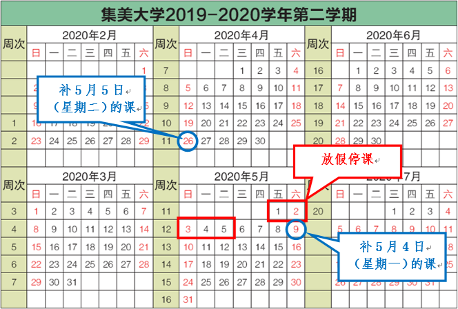 根据《集美大学关于2020年部分节假日安排的通知》(集大办〔2019〕22号),我院劳动节放假、调课安排为:5月1日至5日放假停课,共5天。为避免连续两天上重复的课程,现决定4月26日(星期日)补5月5日(第12周,星期二)的课,5月9日(星期六)补5月4日(第12周,星期一)的课。