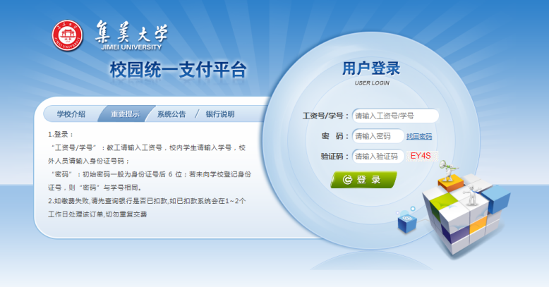 登入账号为学生身份证号,初始密码“JMU@+身份证后6位”。详见缴费平台重要提示。